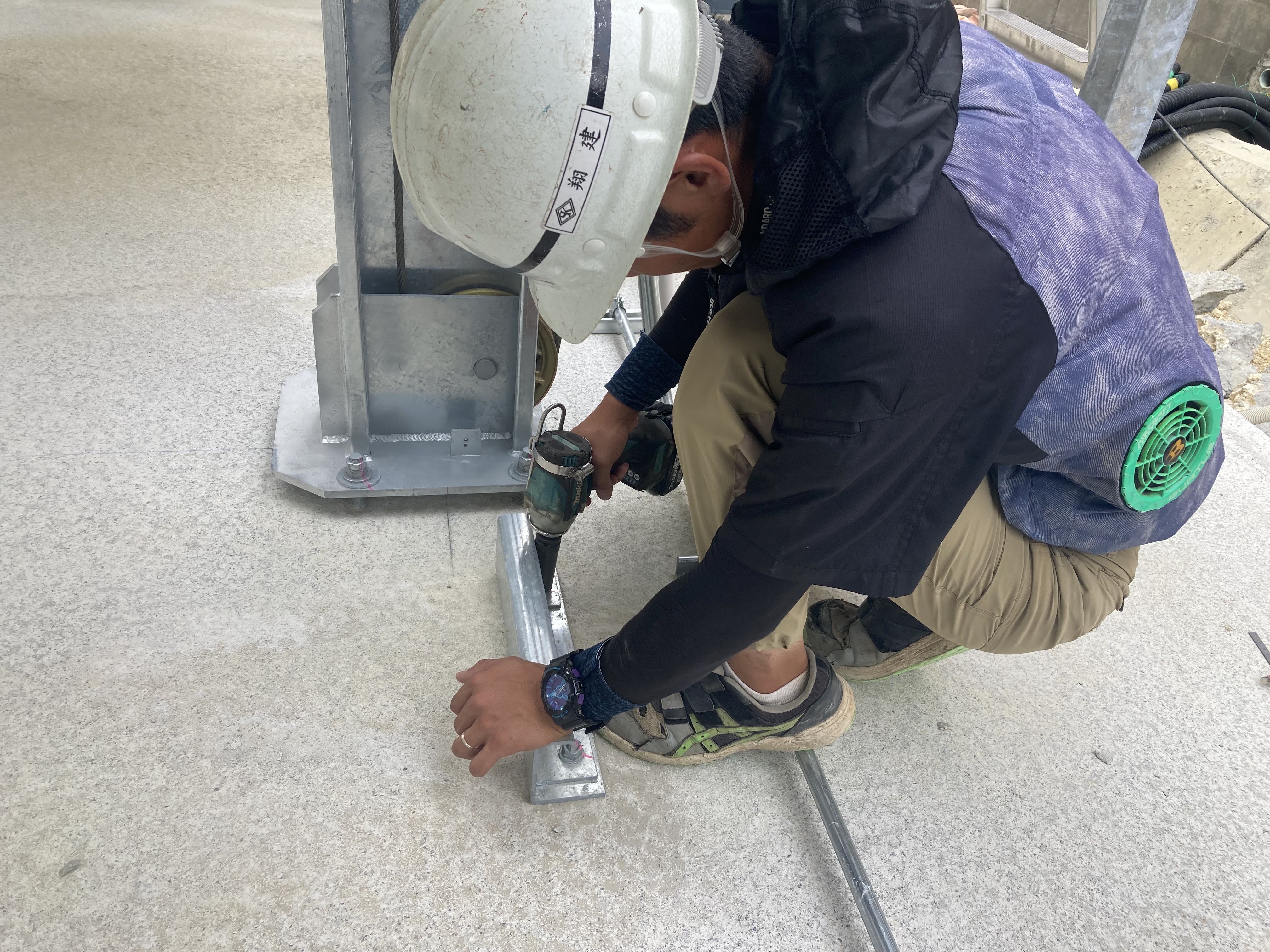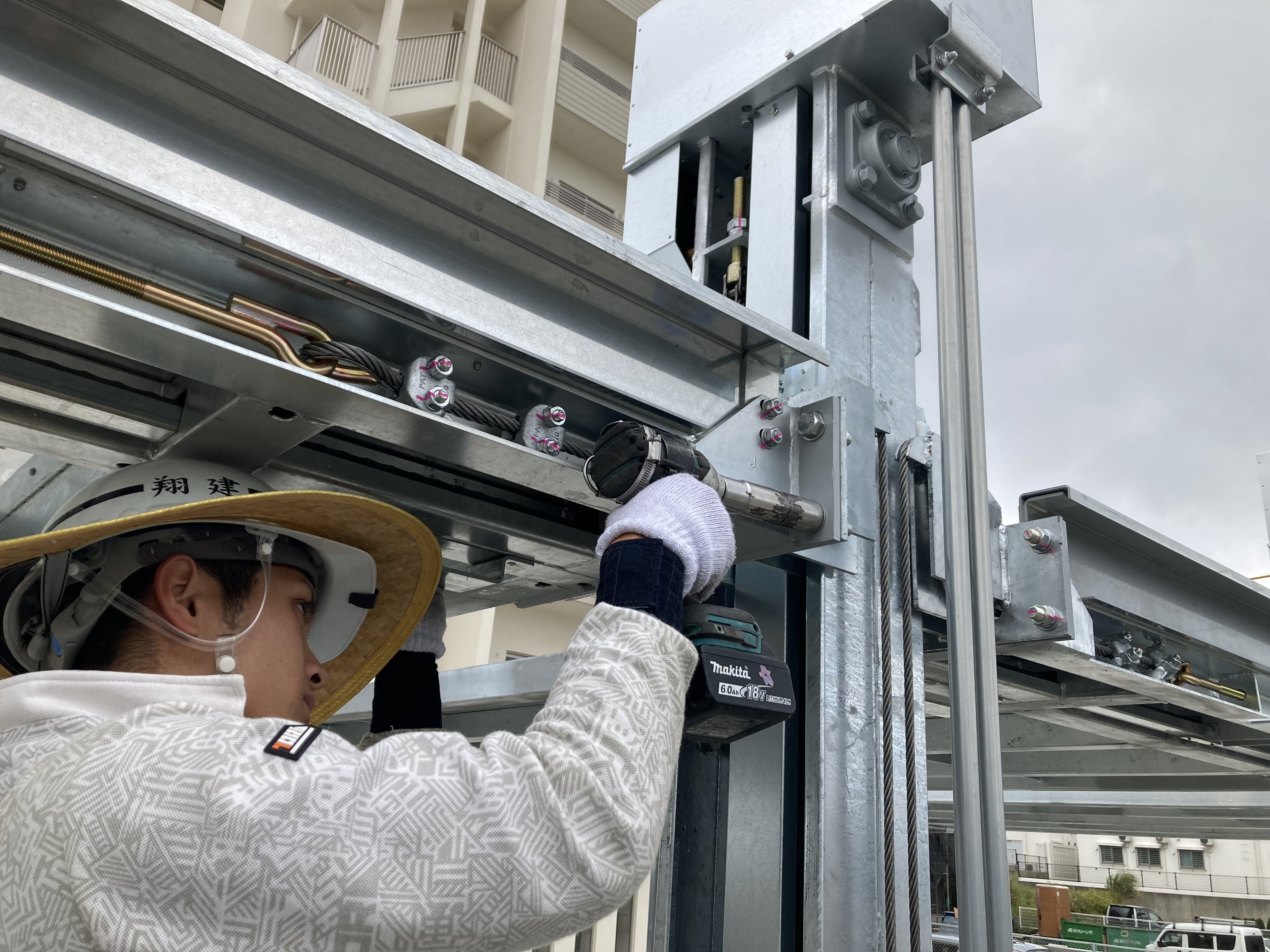 職人さんによるワイヤークリップの締め付け作業、車止めとボルト締め。
